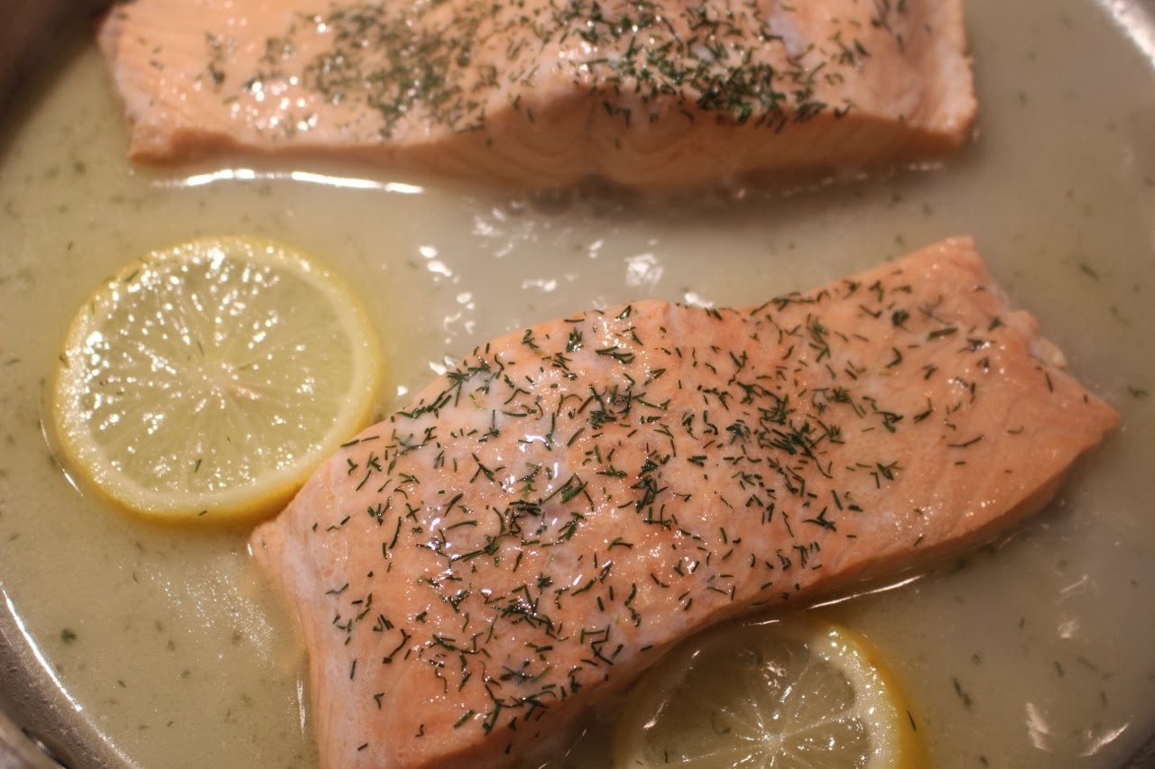 1-1/2 lb salmon fillet, skinned and cut into four portionsTo work towards these lower ratios, the American Heart Association suggests eating salmon and other Omega-3-rich fish as much as twice a week. I suggest you start here with this simple poached salmon that absolutely melts in your mouth.